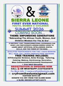 We are proud to announce theĀ First Ever National Youth, Women & Children Summit 2026, a historic 3-day transformational experience designed to empower overĀ 1,500 participantsĀ from across Sierra Leone. This groundbreaking event will focus onĀ Artificial Intelligence, digital skills, and the power of the mind equipping the next generation with the tools they need to thrive in a rapidly changing world.